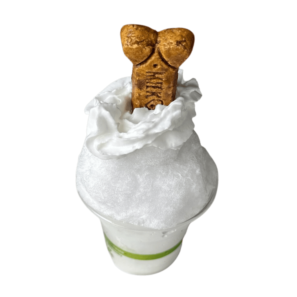 Shave Ice Topped with Whipped Coconut and a Dog Treat
