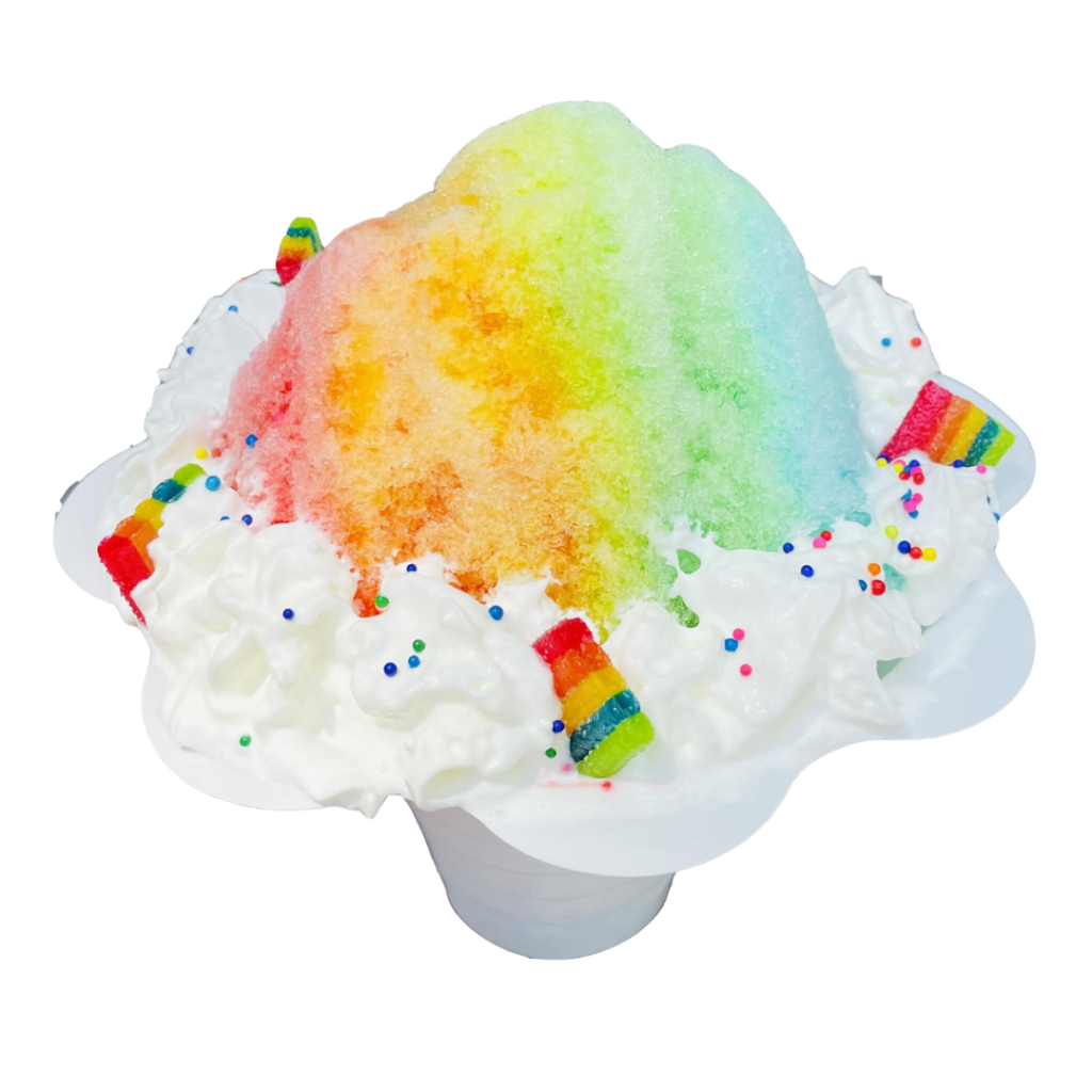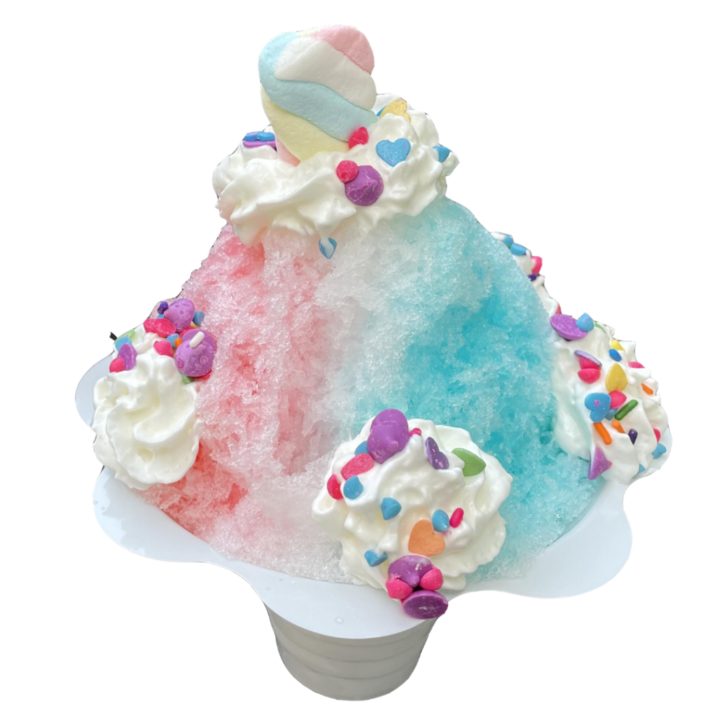 Bubble Gum, Wedding Cake, and Blue Cotton Candy Flavors Topped with Whipped Coconut, Unicorn Puff & Sprinkles